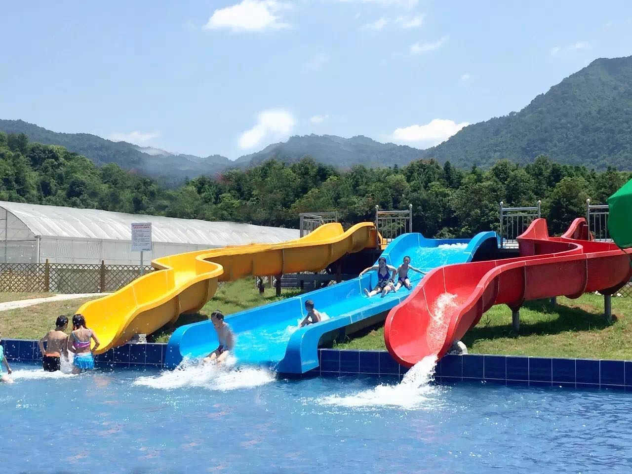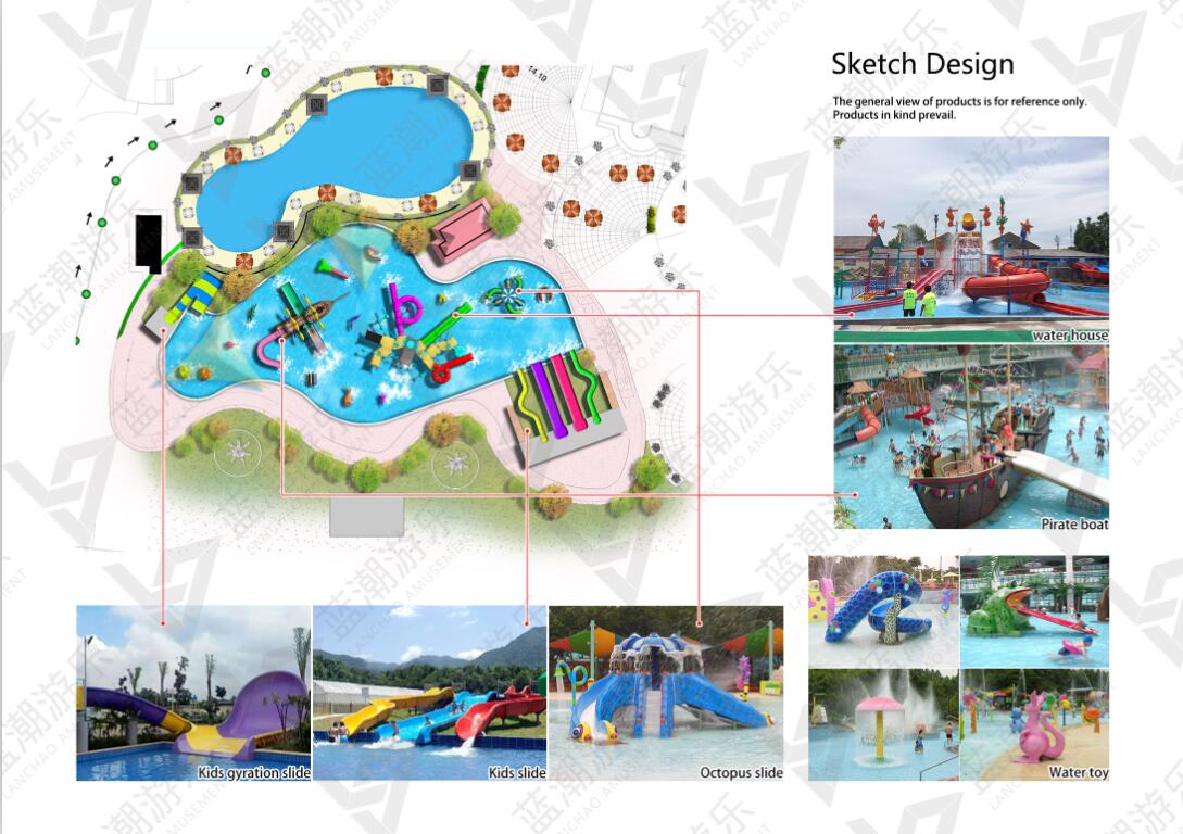 水上乐园设备:家庭小冲天回旋滑梯、家庭组合滑梯、八爪鱼滑梯、海盗船、儿童水屋水寨、蛇形滑梯、青蛙滑梯、雨蘑菇、喷水袋鼠,戏水池的面积近1300平方米。