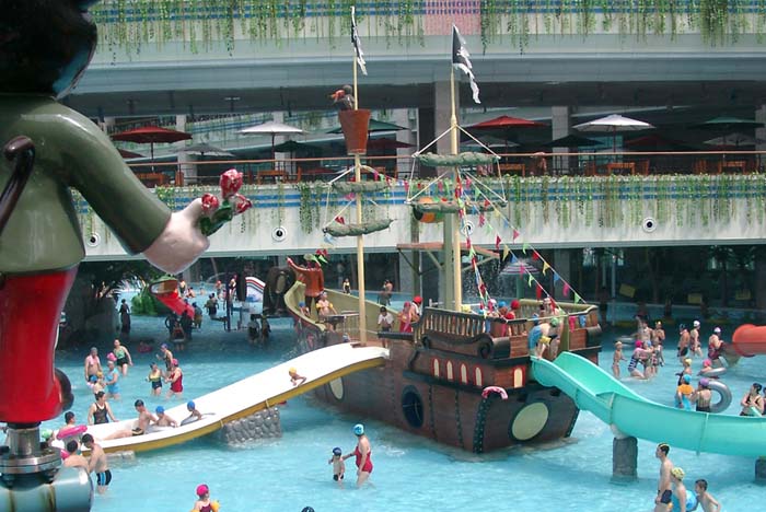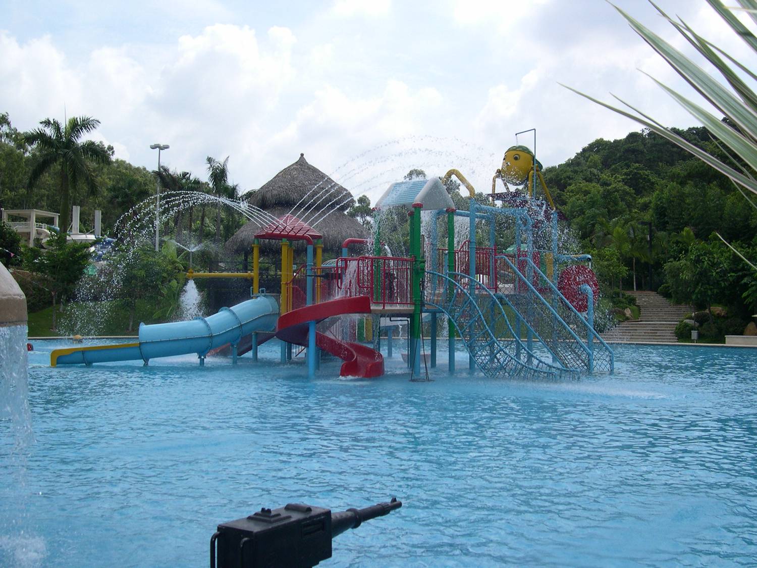 水上乐园设备:家庭小冲天回旋滑梯、家庭组合滑梯、八爪鱼滑梯、海盗船、儿童水屋水寨、蛇形滑梯、青蛙滑梯、雨蘑菇、喷水袋鼠,戏水池的面积近1300平方米。